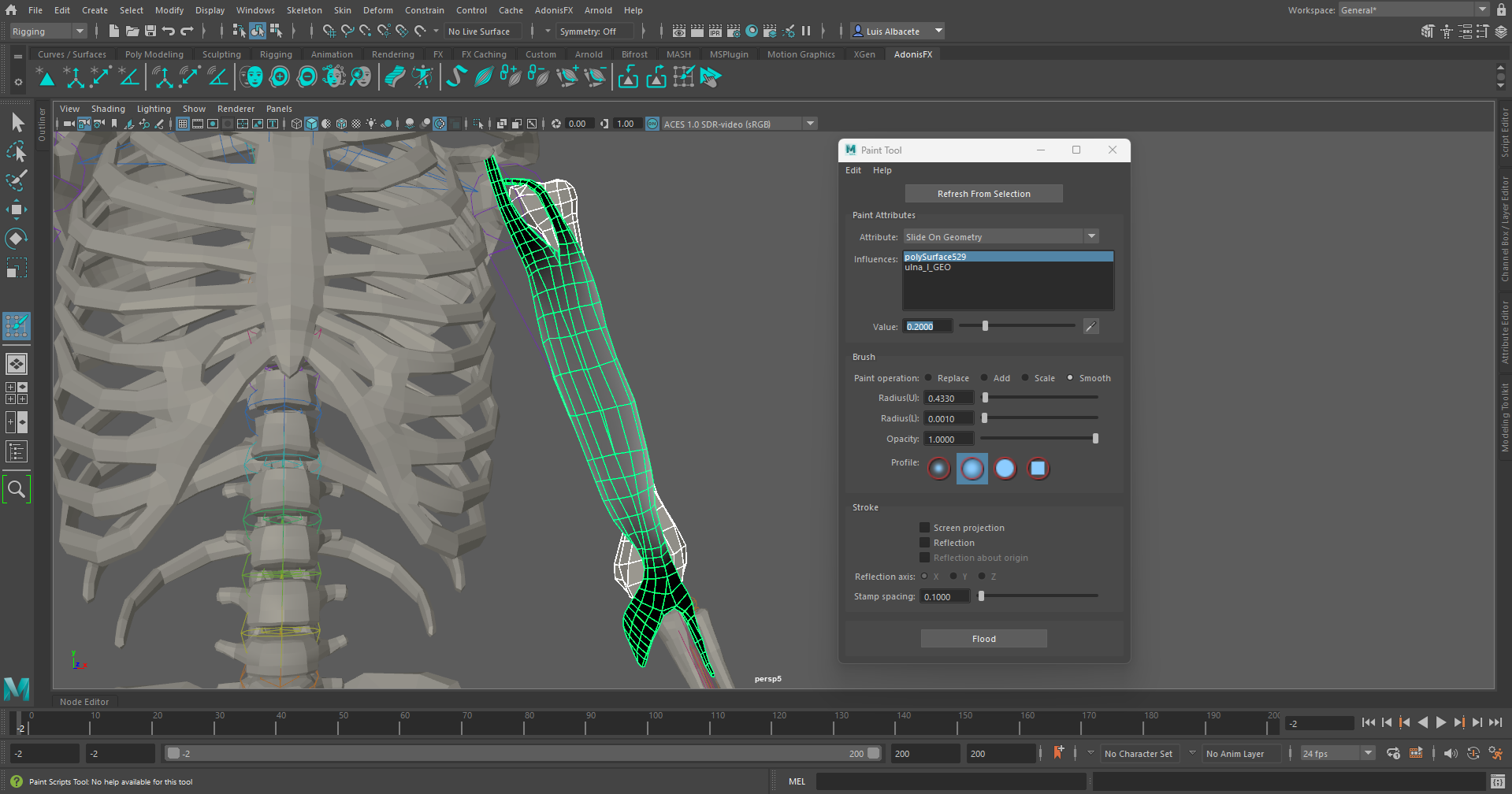 With this basic paint setup the AdnSkinMerge deformer will now show the results of skin simulation transferred to the final mesh.