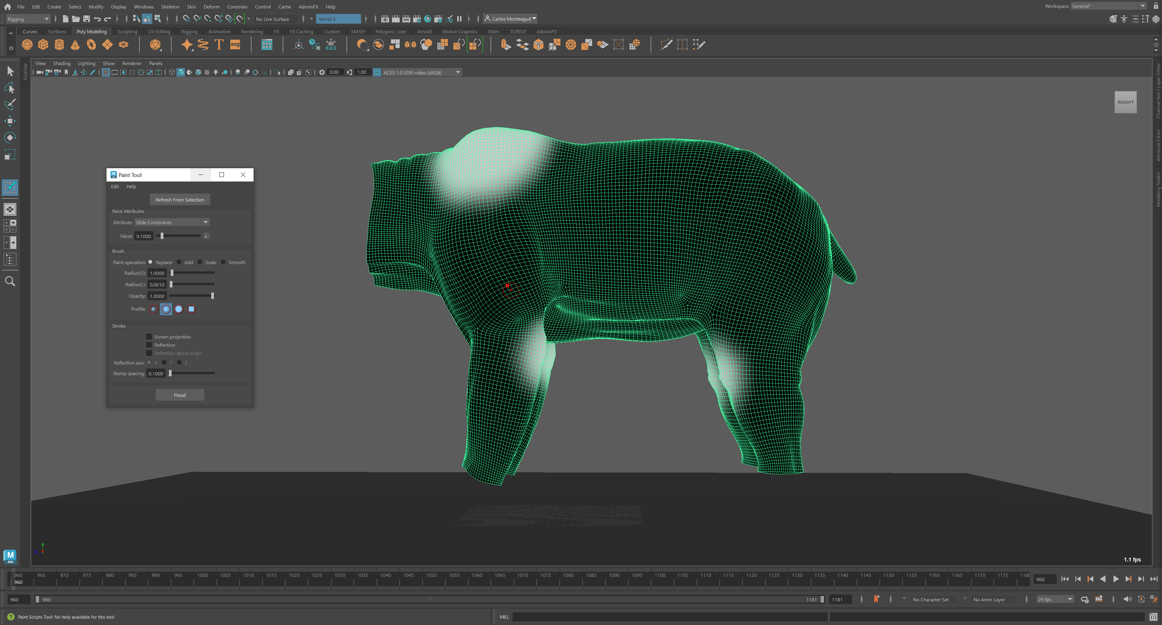 Finally, paint Slide On Segment or Slide On Geometry Constraints (if added). It is recommended to paint only the vertices that are not attached to the rig. In this example, the tendons are painted with a value of 0.0, while the rest of the shape is painted to 1.0 or lower values.