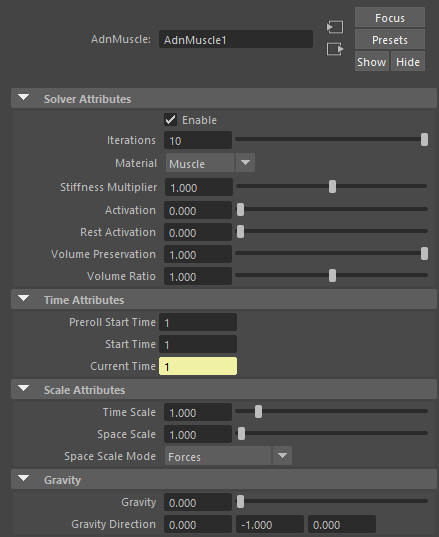 | Volume Preservation | Float | 1.0 | ✓ | The amout of volume to preserve of the current simulated muscle. Has a range of [0.0, 1.0]. Upper limit is soft, higher values can be used. |