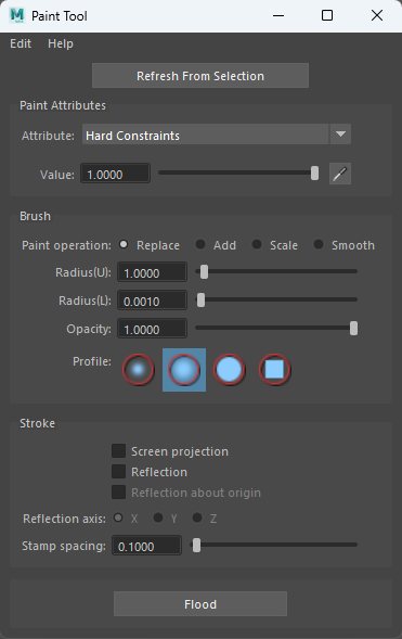 - If the context does not allow painting, it is probably because the selected node is not a transform mesh node with an AdonisFx paintable deformer. Please, select the transform mesh node and click Refresh From Selection or restart the AdonisFX Paint Tool.